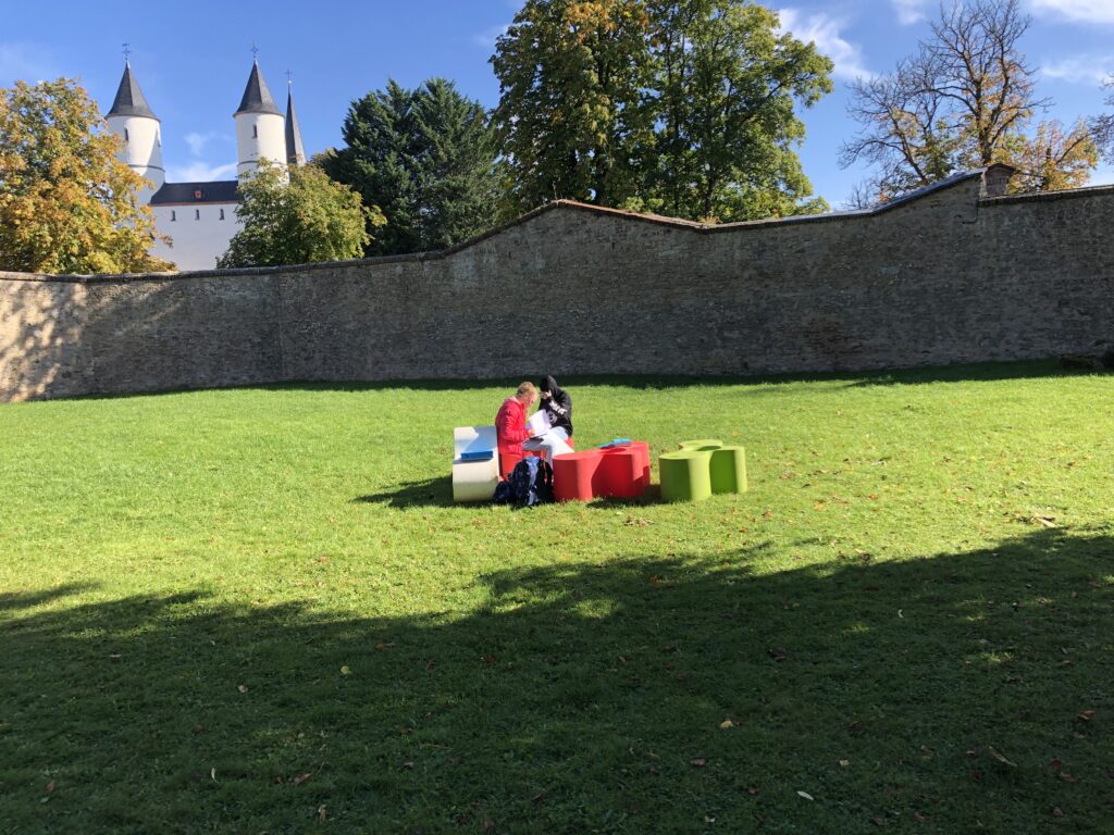 Mobile Sitzgelegenheiten aus wetterfestem Kunststoff dienen als Sitzgelegenheit bei Gruppenarbeiten im Freien, in den Pausenzeiten und wenn mal ebenmehren SchülerInnen zusammen zu sitzen möchten.